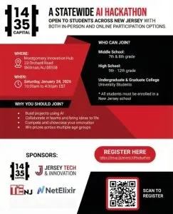We’re co-sponsoring and hosting a New Jersey statewide AI Hackathon this coming Saturday, January 24th from 10:00am to 4:30pm EST at the Montgomery Innovation Hub